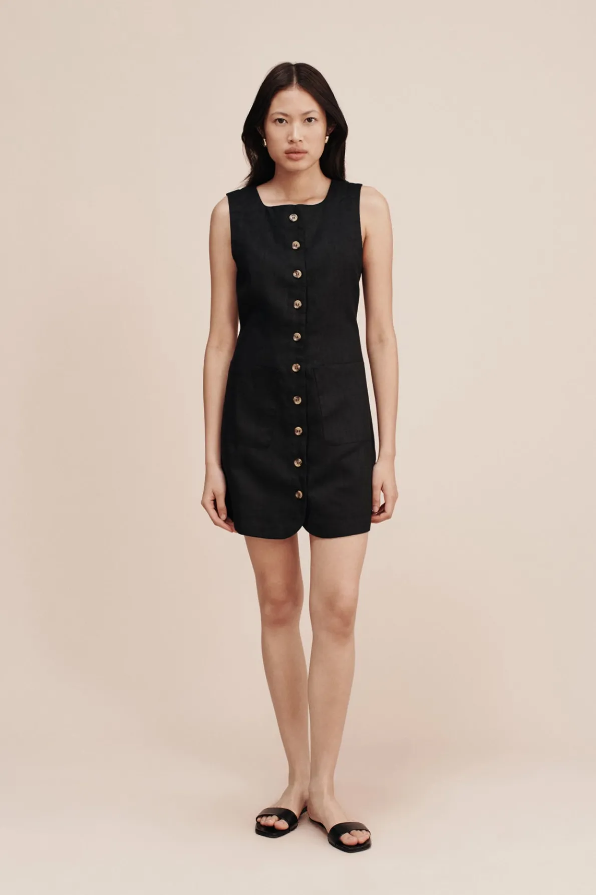 An adaptation of our beloved Emma Vest, The Emma Mini Dress is crafted from 100% linen and is perfect for both day and evening wear. It features an elegant high neck, centre front button fastenings and a curved hem. It has an adjustable buckle at the back to cinch in the waist and tailor the fit.
