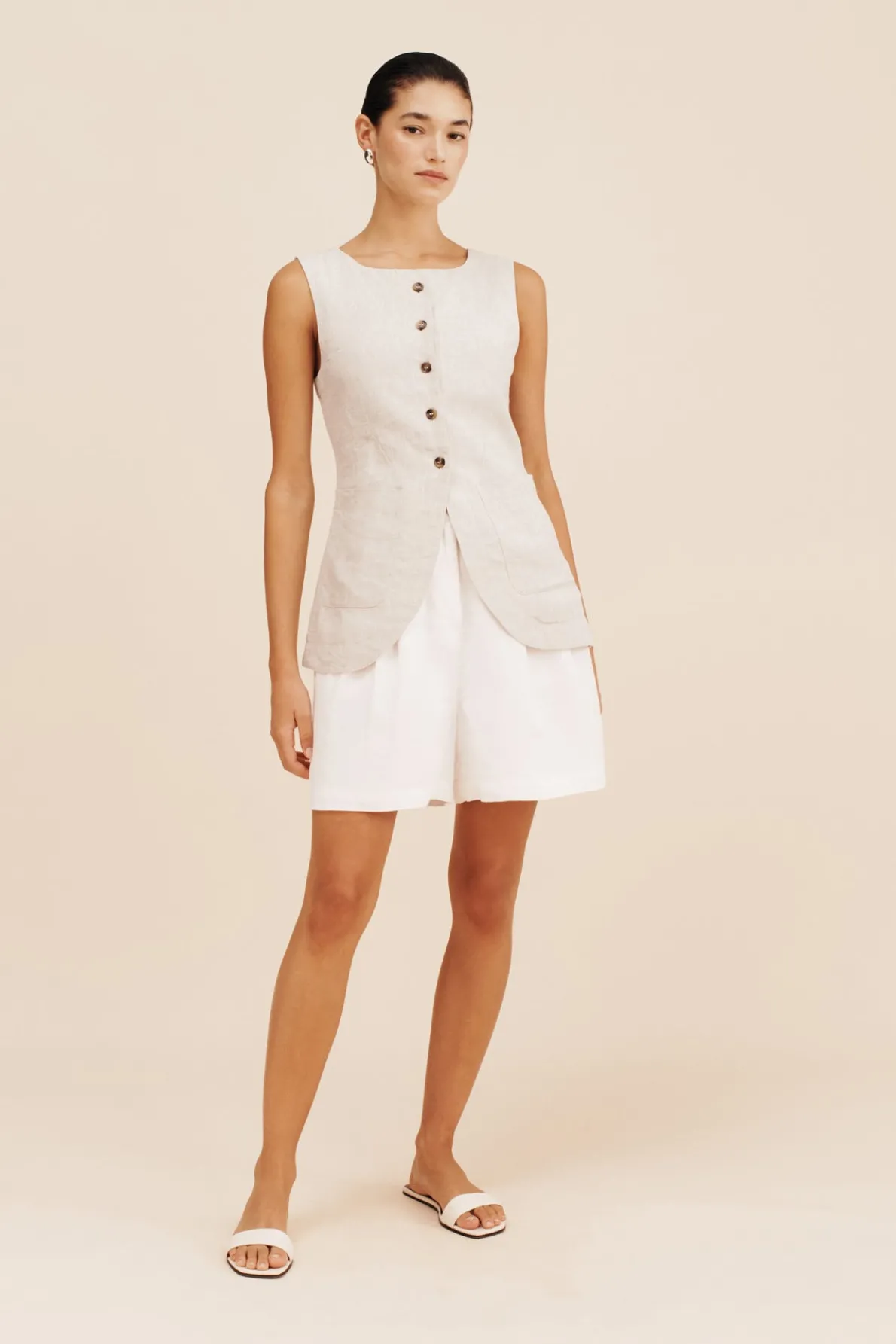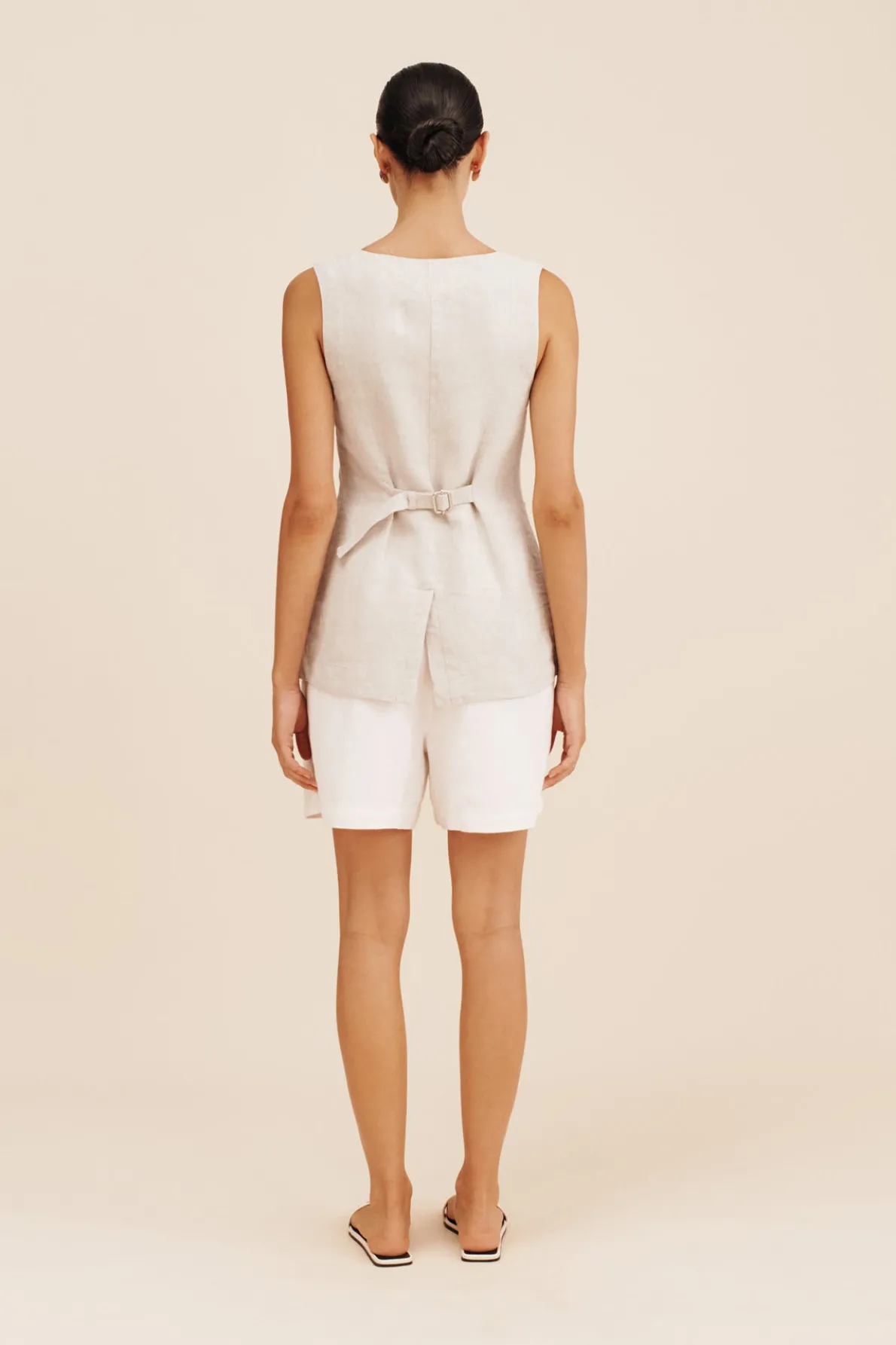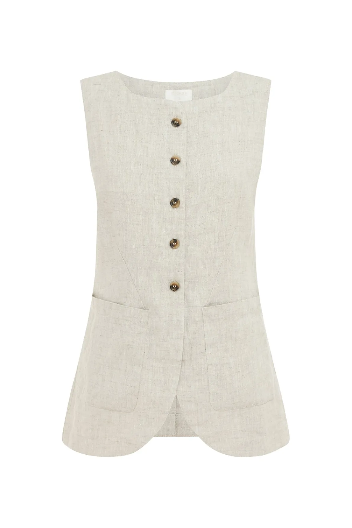 The Emma Vest is cut from 100% certified linen and is designed for a close fit. It features an elegant high neckline, flared peplum hem and a centre back split to allow for movement. Style yours as a set with the Emma Pencil Skirt or with high-rise jeans.