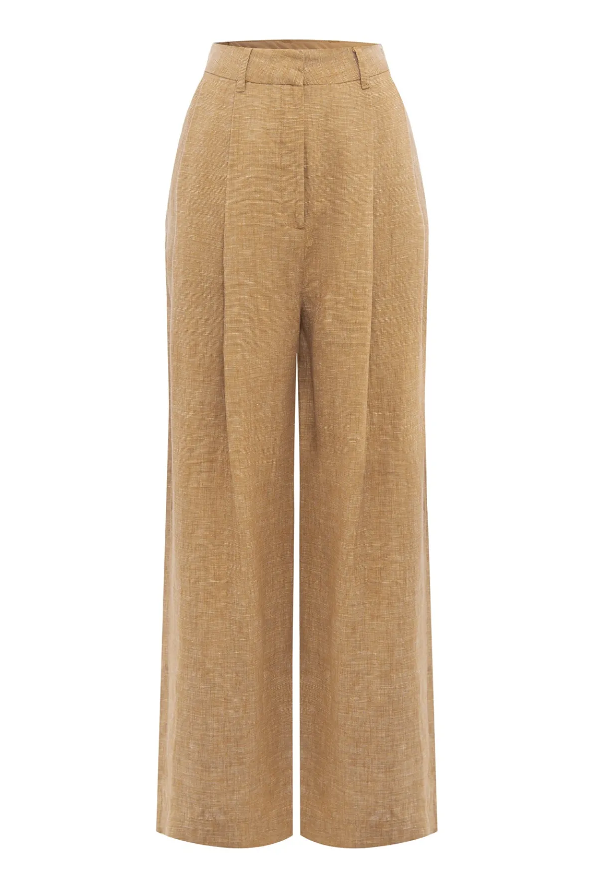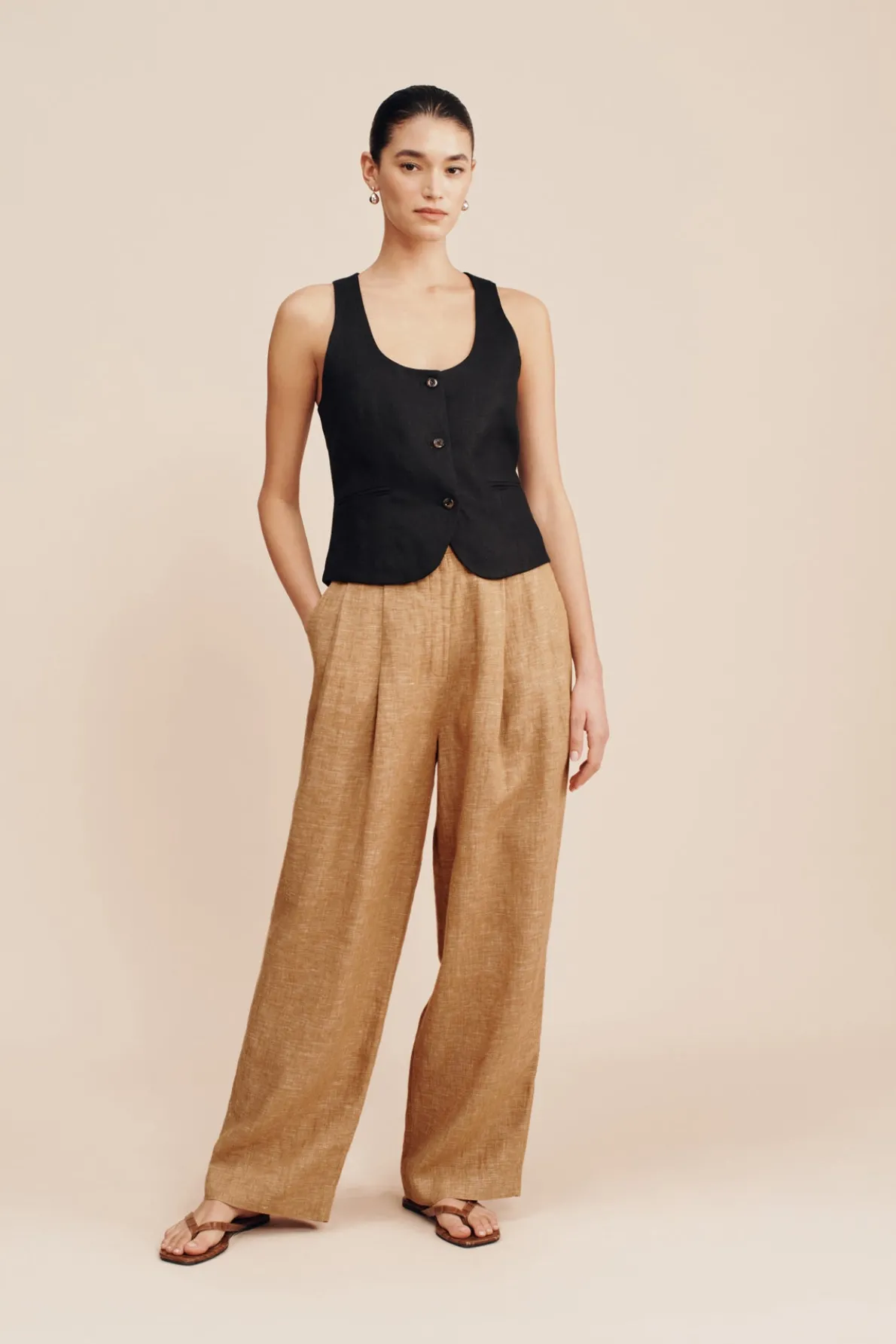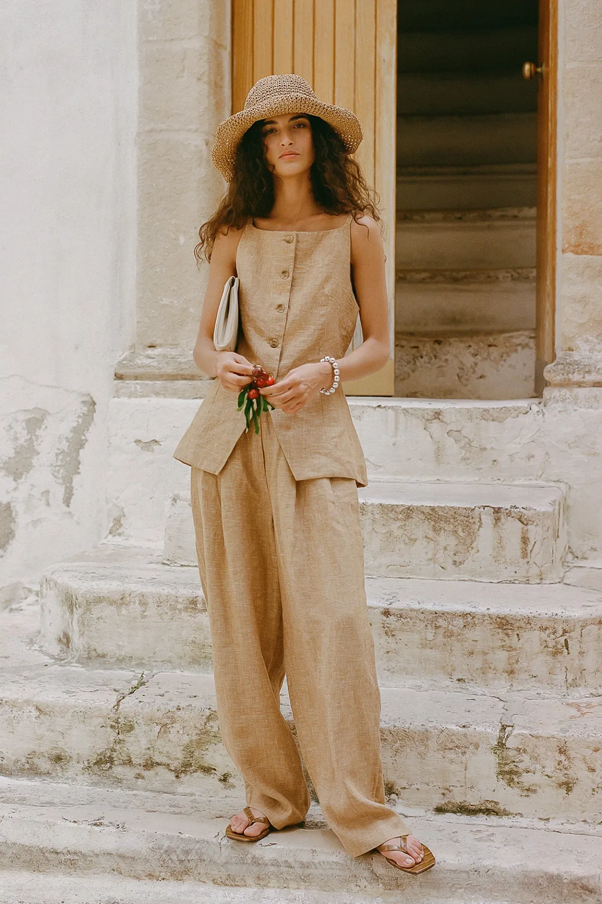 Crafted from 100% linen in an exclusive POSSE handloom, the Nancy Trousers are designed with a flattering, high-rise waist. They feature roomy, wide legs and front pleats to create volume. Wear yours as a set with the matching Nancy Gilet or pair them with a simple tank and slides.