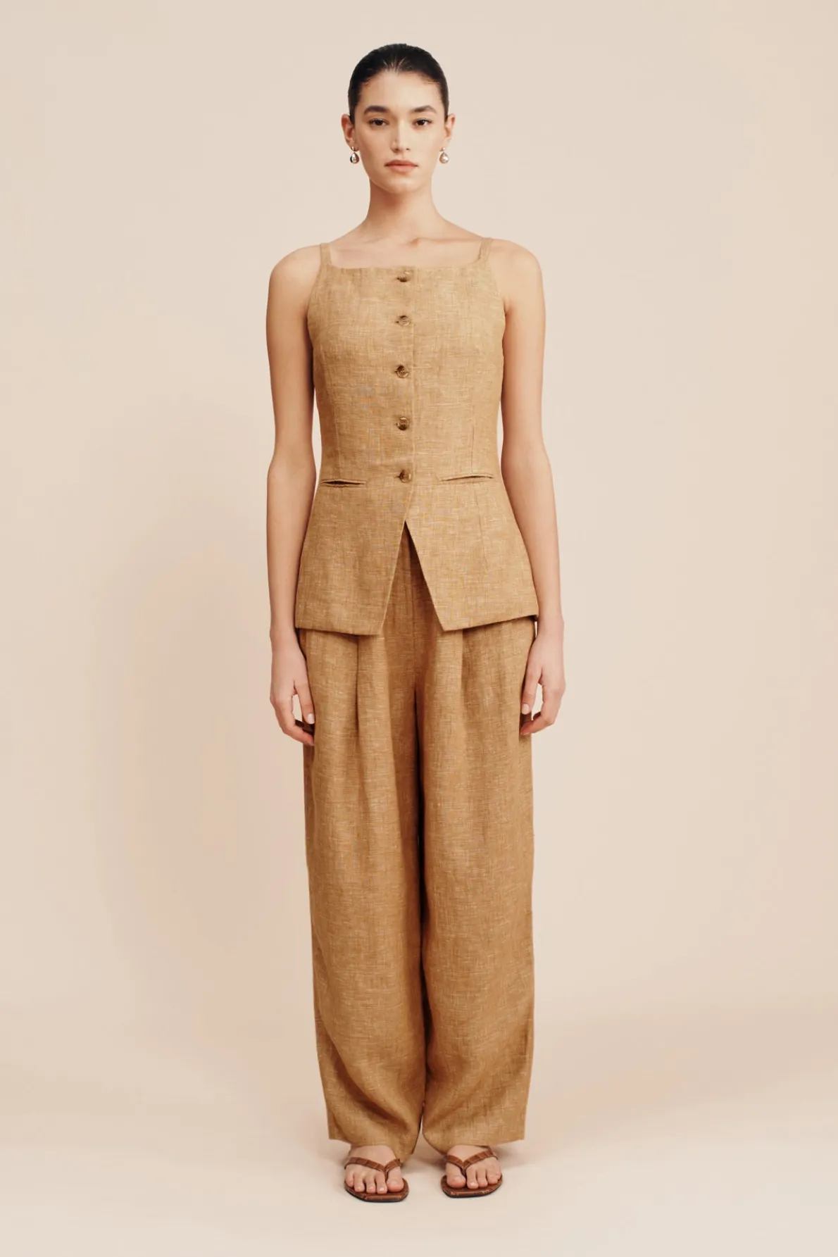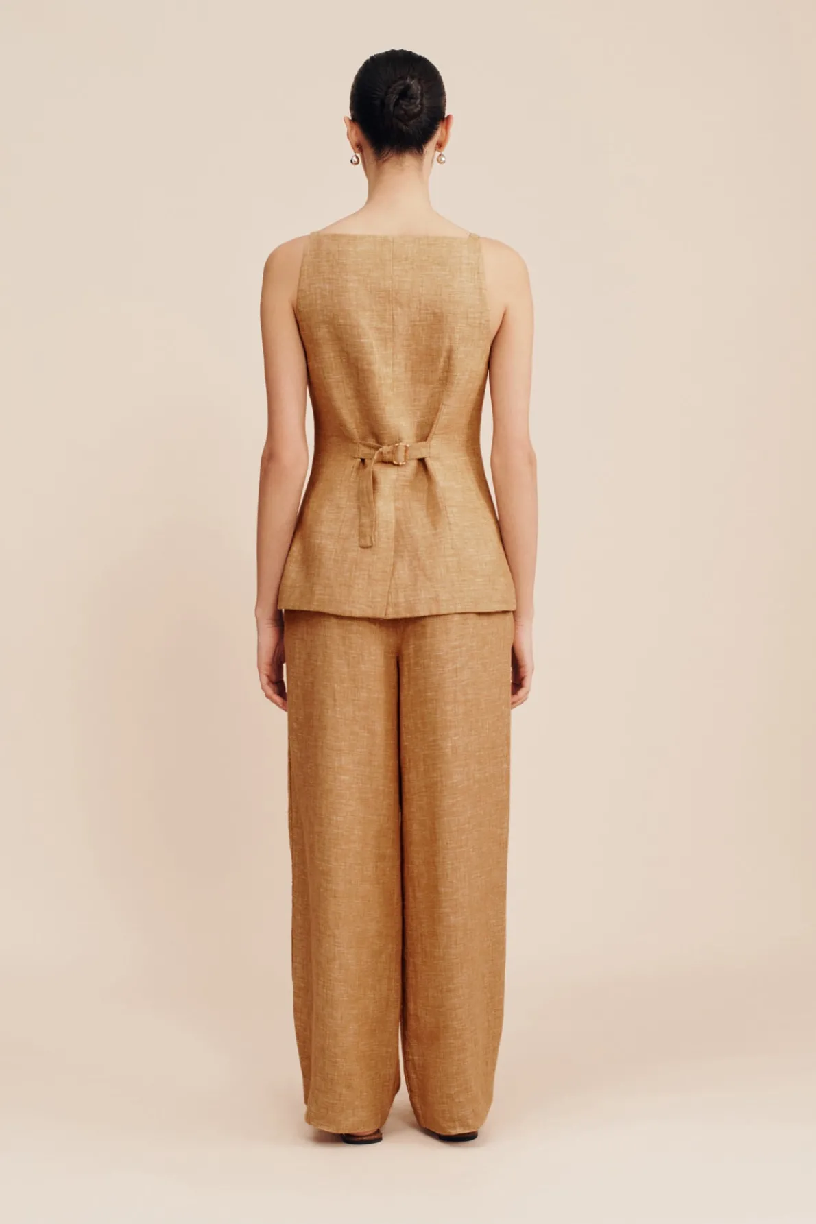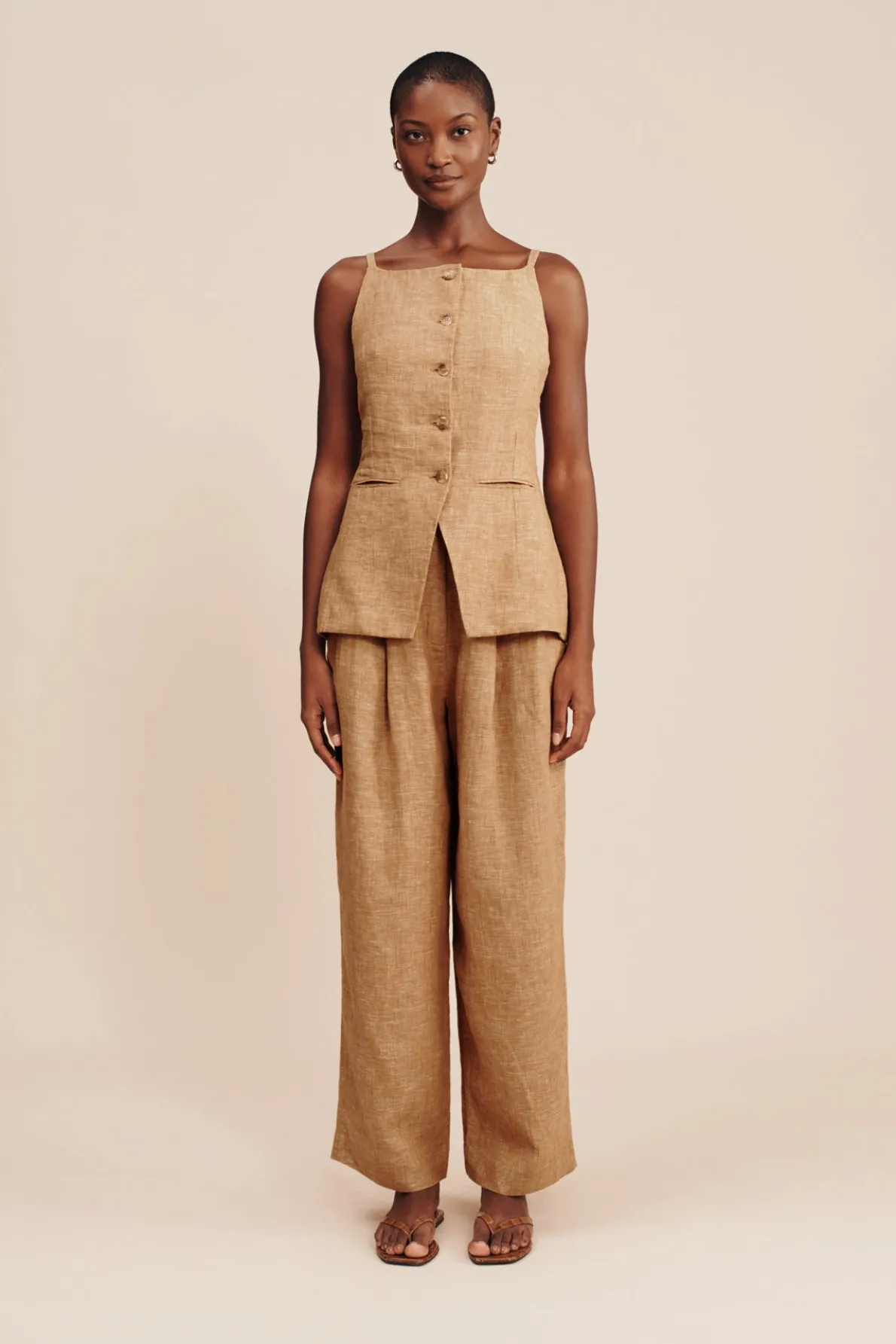 Crafted from 100% linen in an exclusive POSSE handloom, the Nancy Trousers are designed with a flattering, high-rise waist. They feature roomy, wide legs and front pleats to create volume. Wear yours as a set with the matching Nancy Gilet or pair them with a simple tank and slides.
