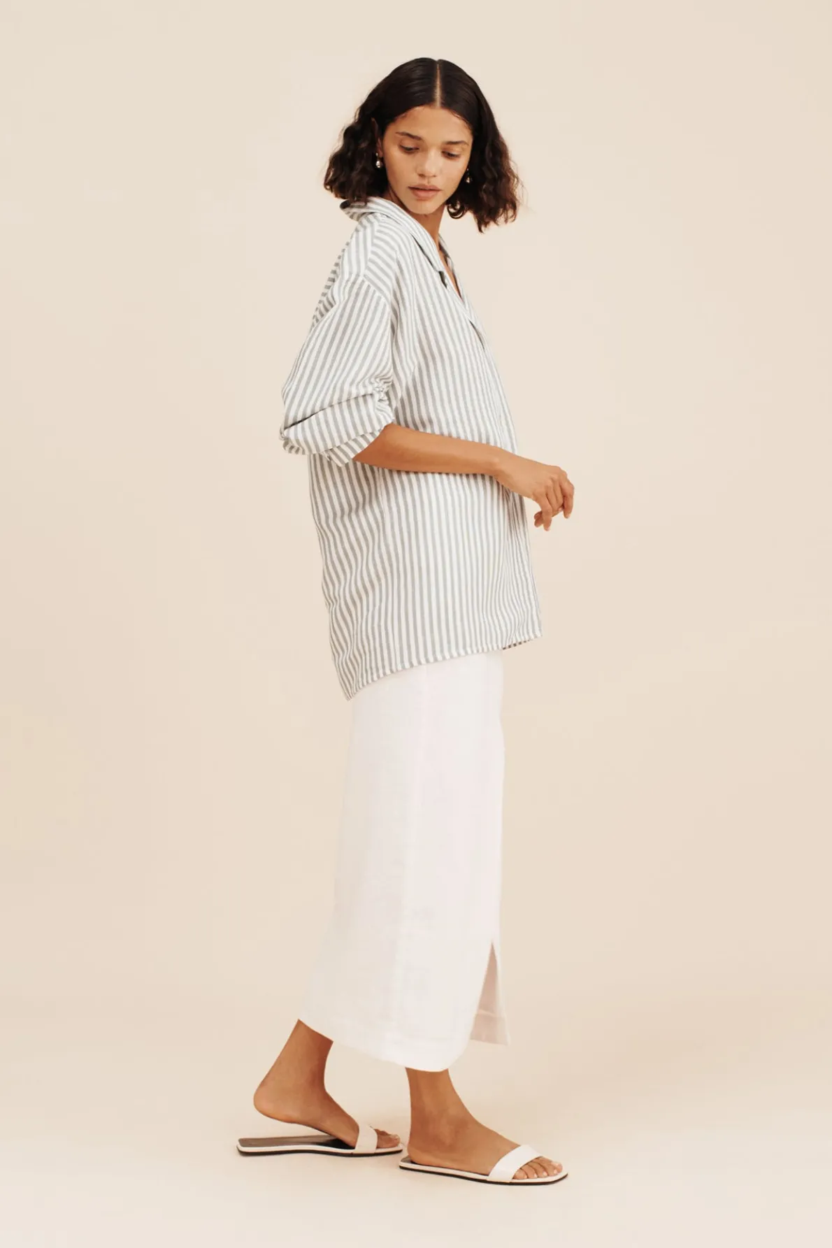 Patterned with classic stripes, the Zadie Shirt features a v-shaped neckline, dropped shoulders and adjustable tabs at the cuffs. Designed for a relaxed fit, it looks just as chic styled on its own as it does with the matching Lorenzo pants.