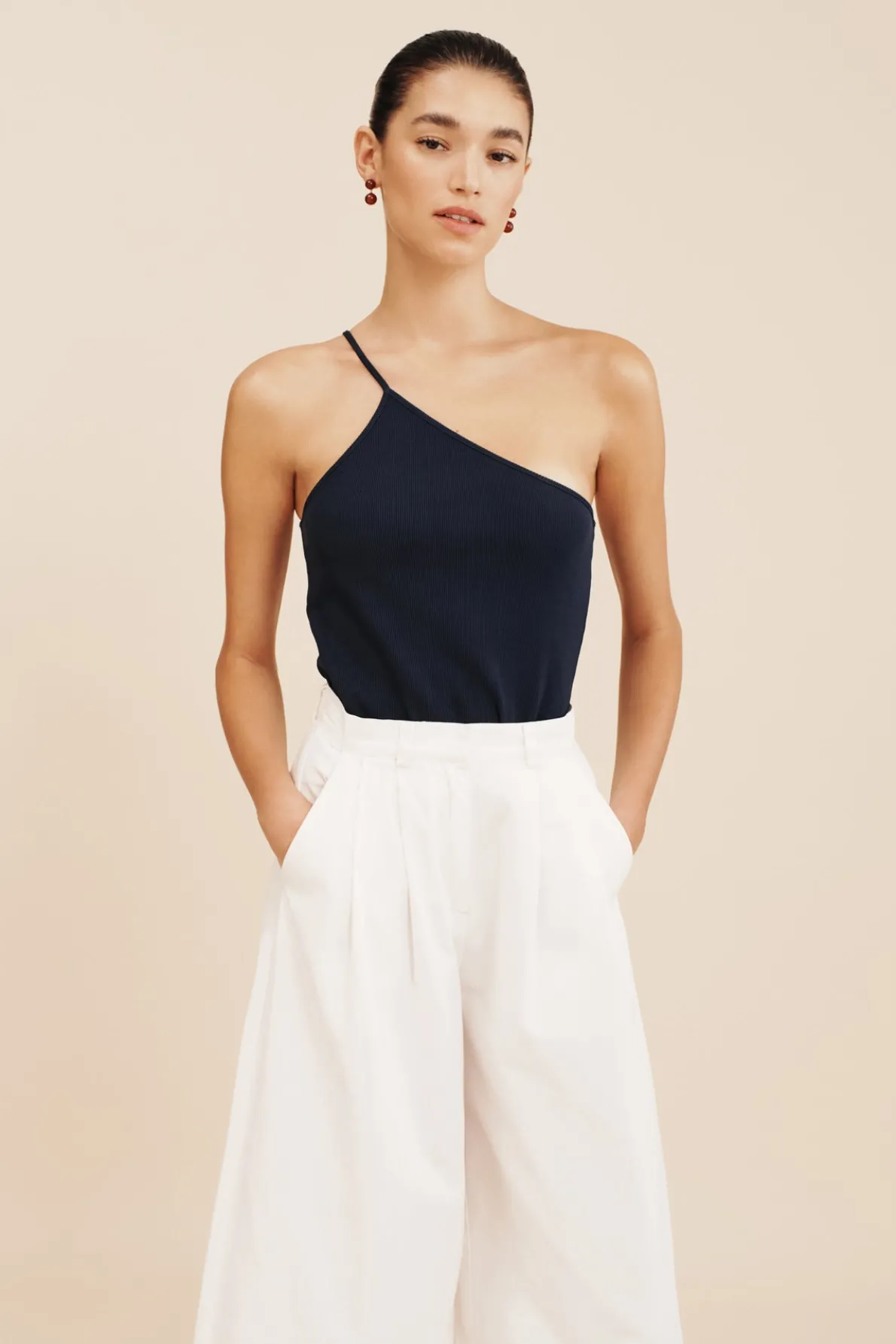 A classic wardrobe essential, the Axel One Shoulder Tank is ribbed for a close fit and blended with stretch for comfort. It features an elegant one shoulder silhouette with a thin spaghetti strap. Soft, simple and perfect for layering.