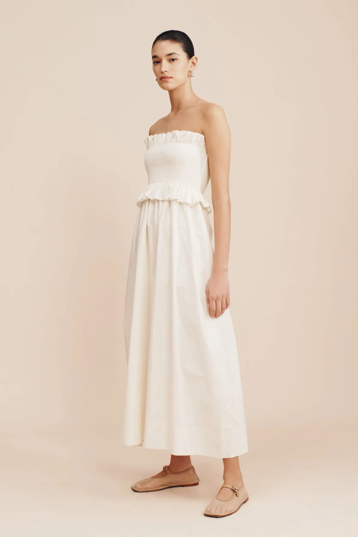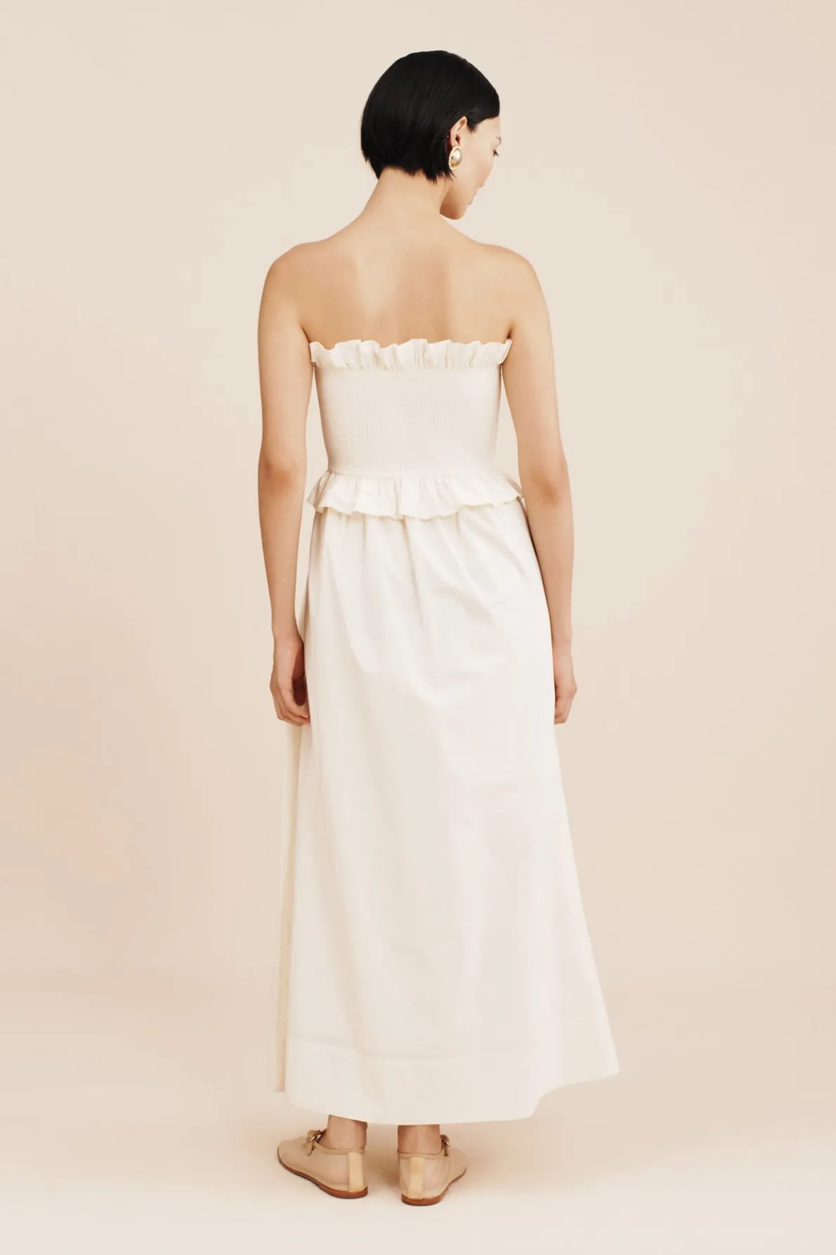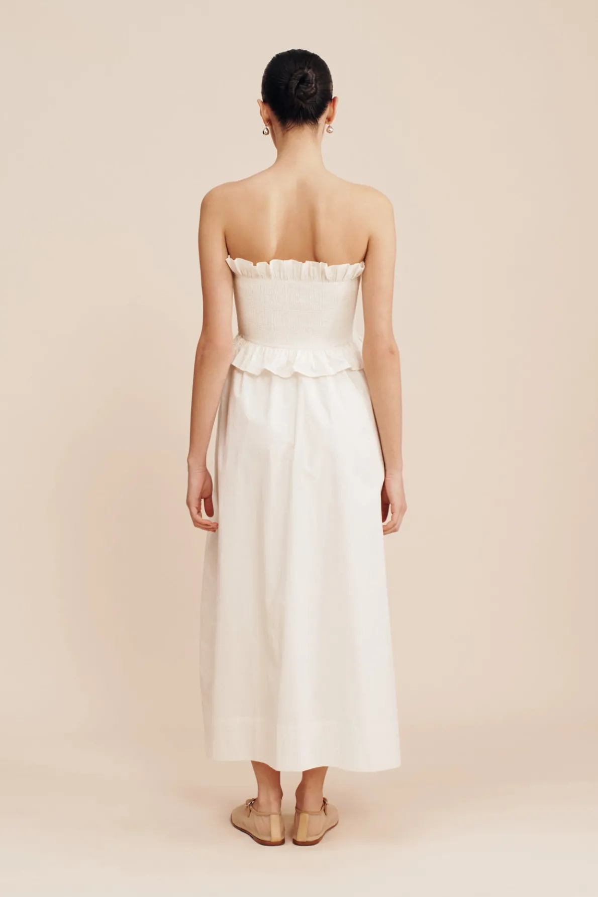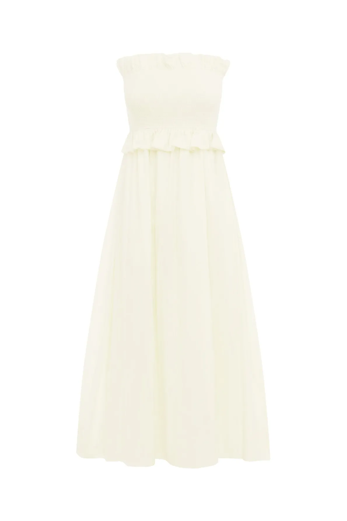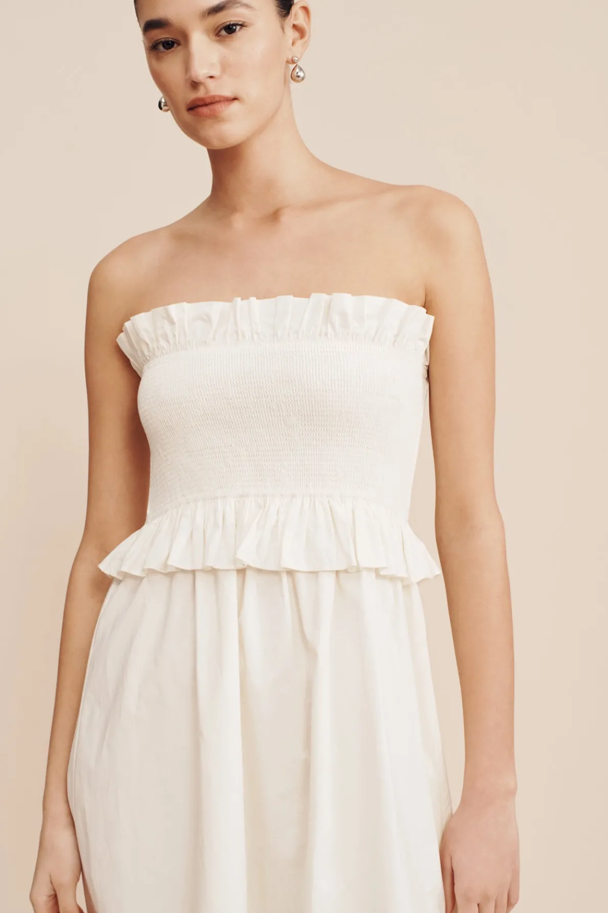 Designed with sun-drenched days in mind, the Coby Strapless Dress is perfect for both day and evening wear. It features statement frills and elasticated shirring throughout the bodice before falling to a relaxed skirt. Style yours with heels or flats.