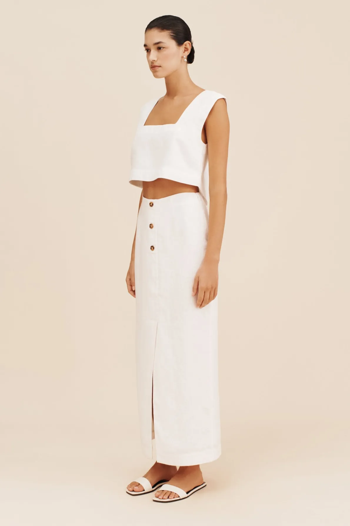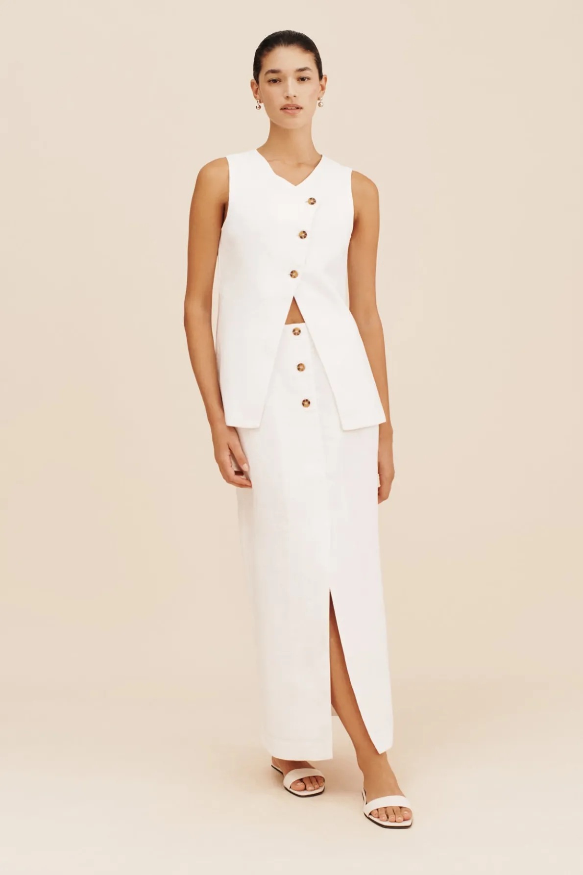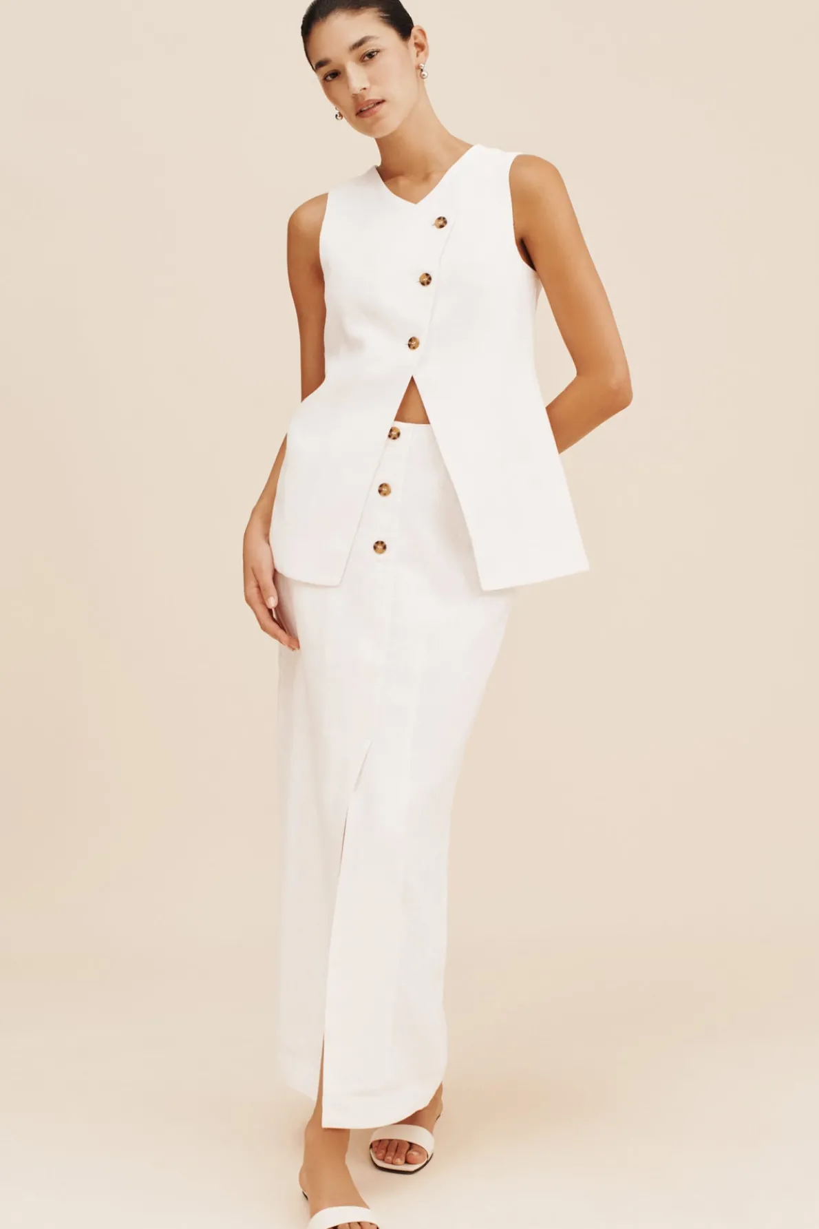 The Gigi Column Skirt is cut from certified linen and is designed to sit high on the waist. It features centre front buttons and a statement front split. Style yours as a set with the coordinating Gigi Gilet. The crisp white hue makes it perfect for daytime events or a memorable bridal moment.