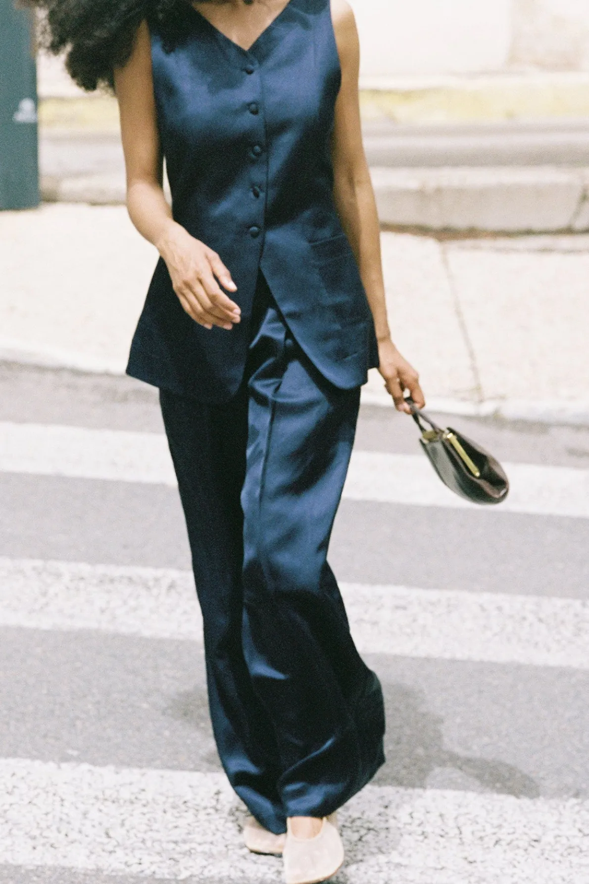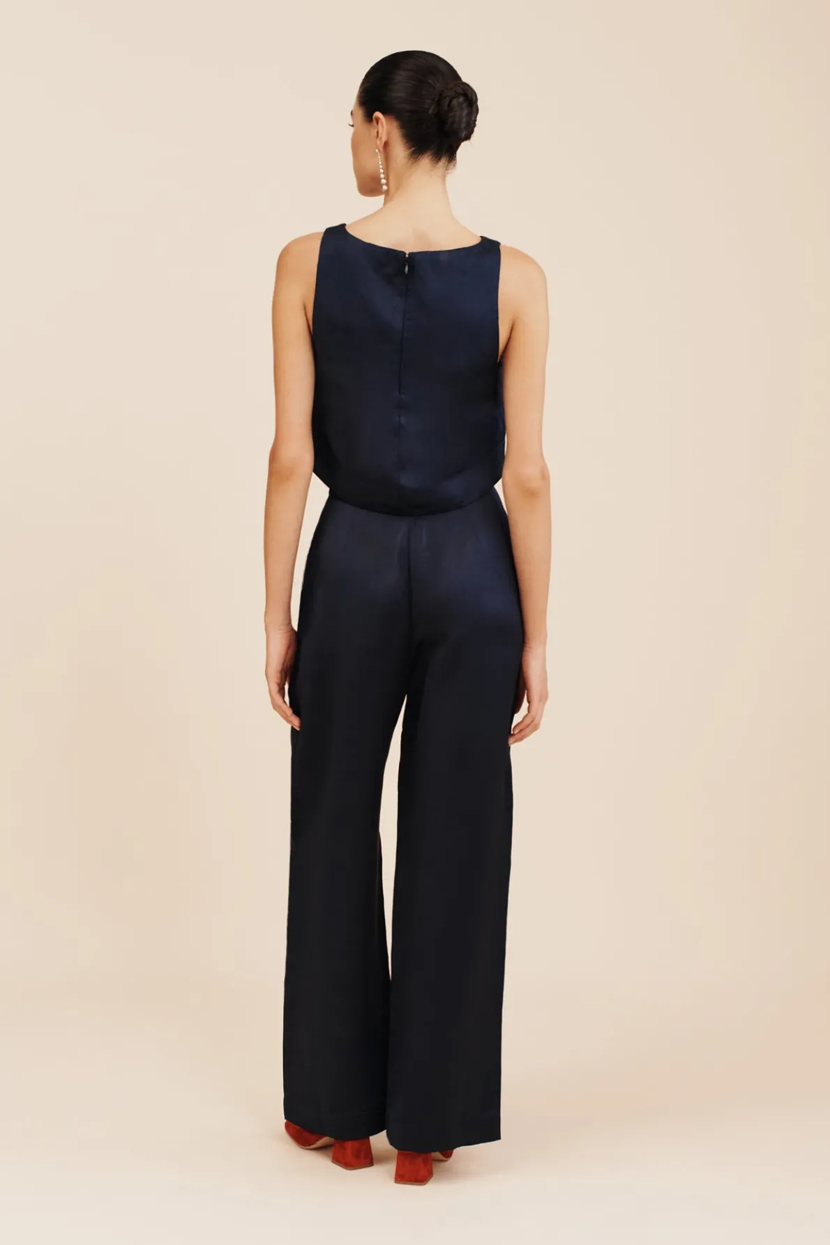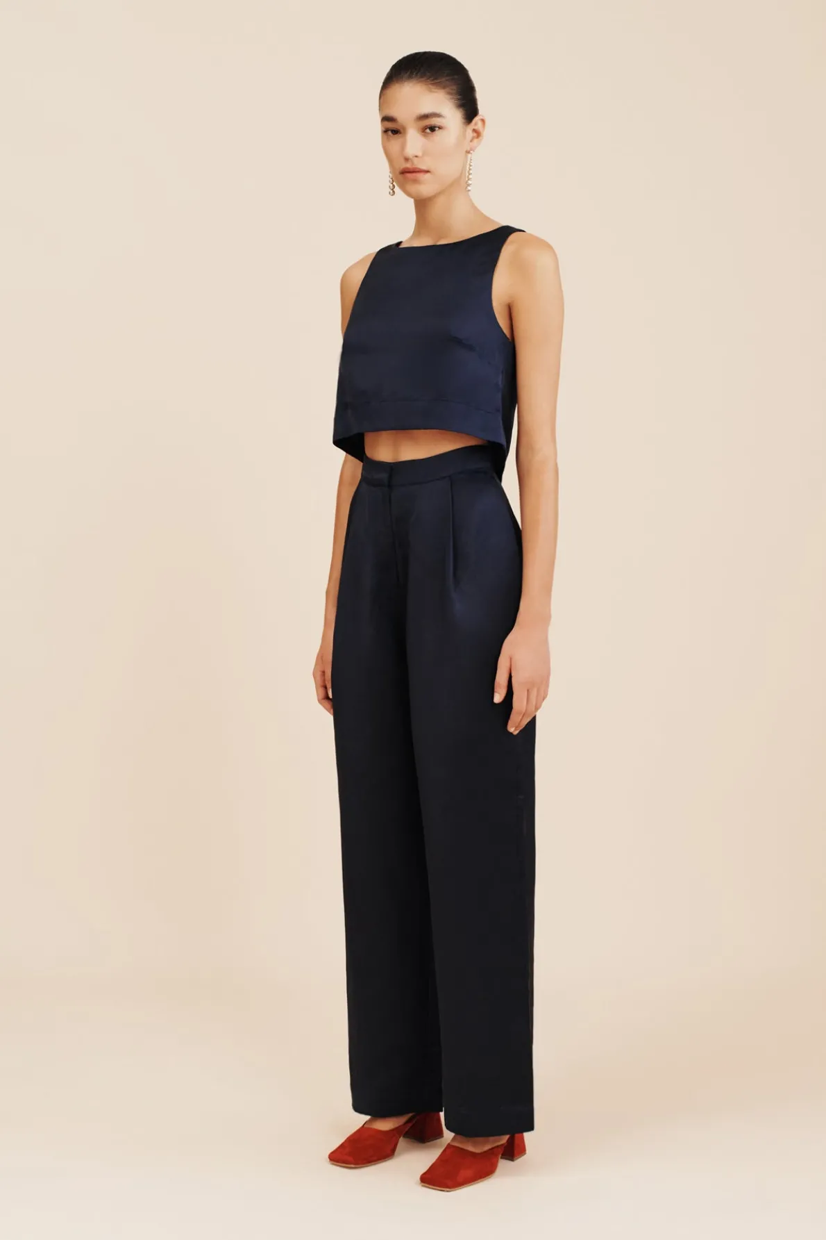 The Leila Trousers have a glossy satin finish, making them perfect for evening wear or special events. Designed to sit high on the waist, they feature a wide-leg profile with pressed creases through the front. Style yours as a set with the Joy Crop Top or Lorenzo High Neck Vest.