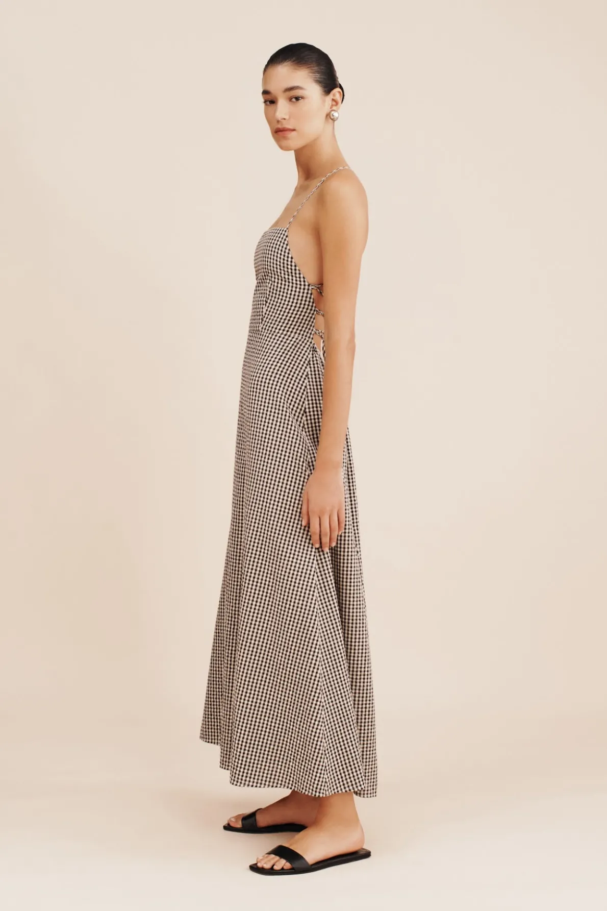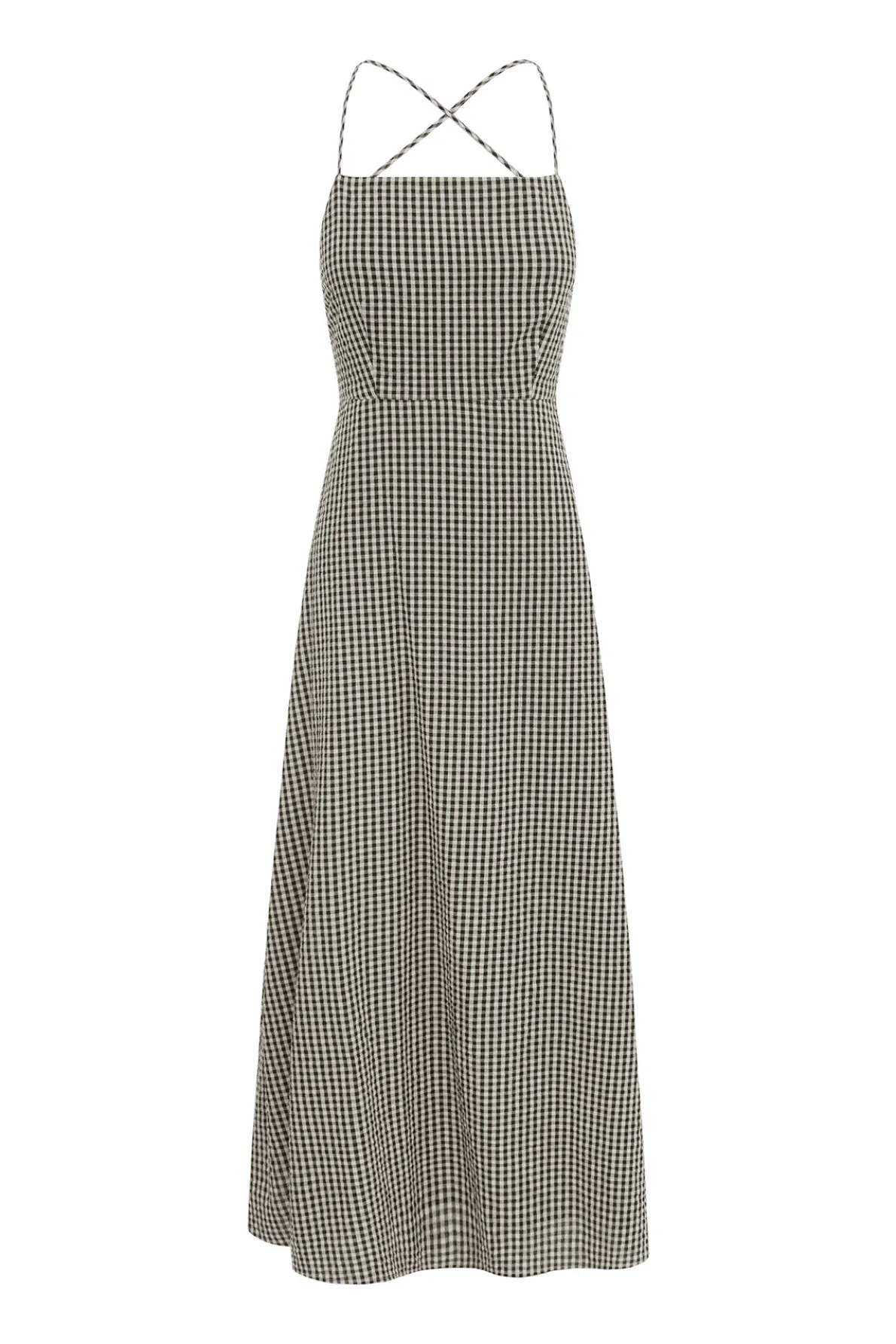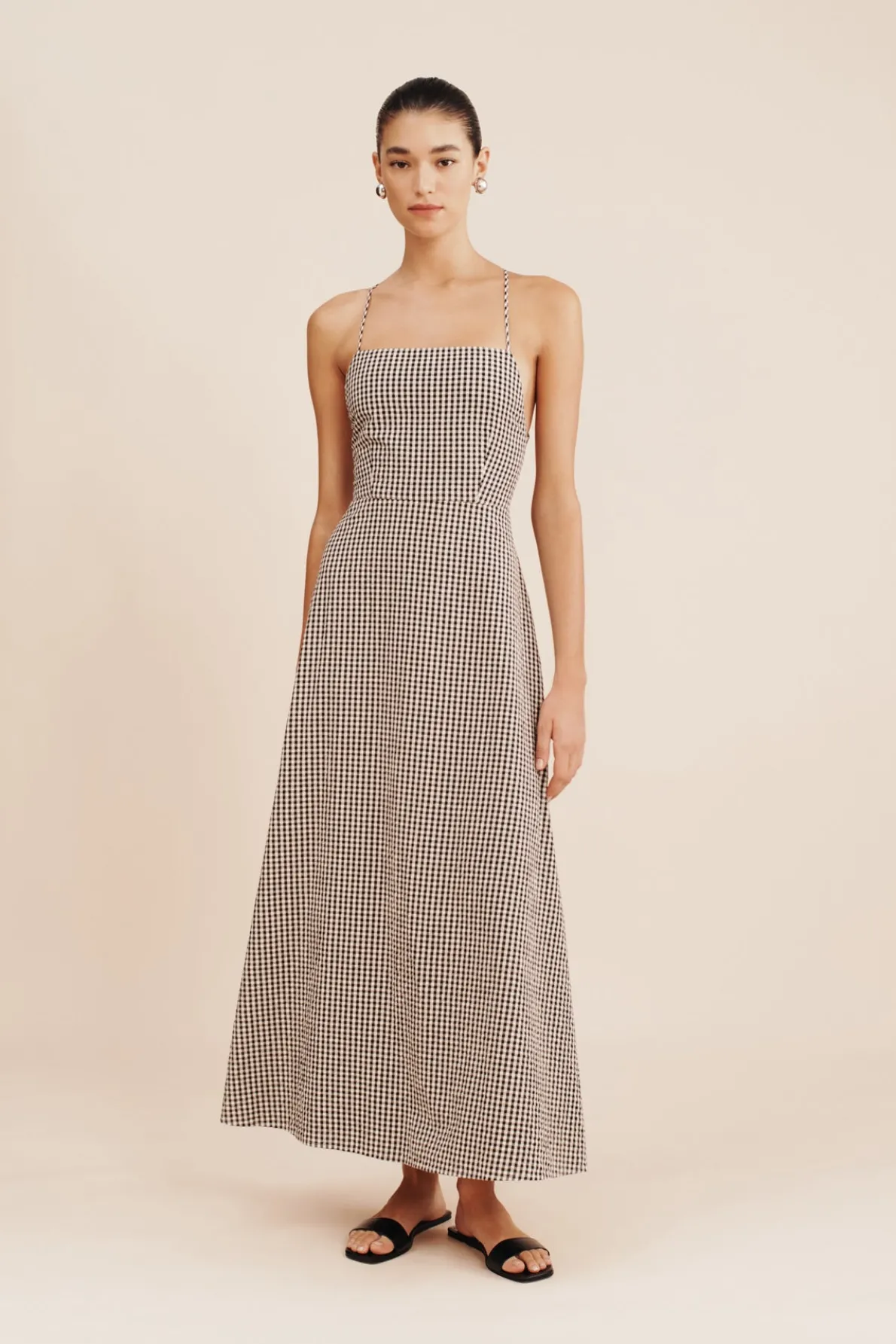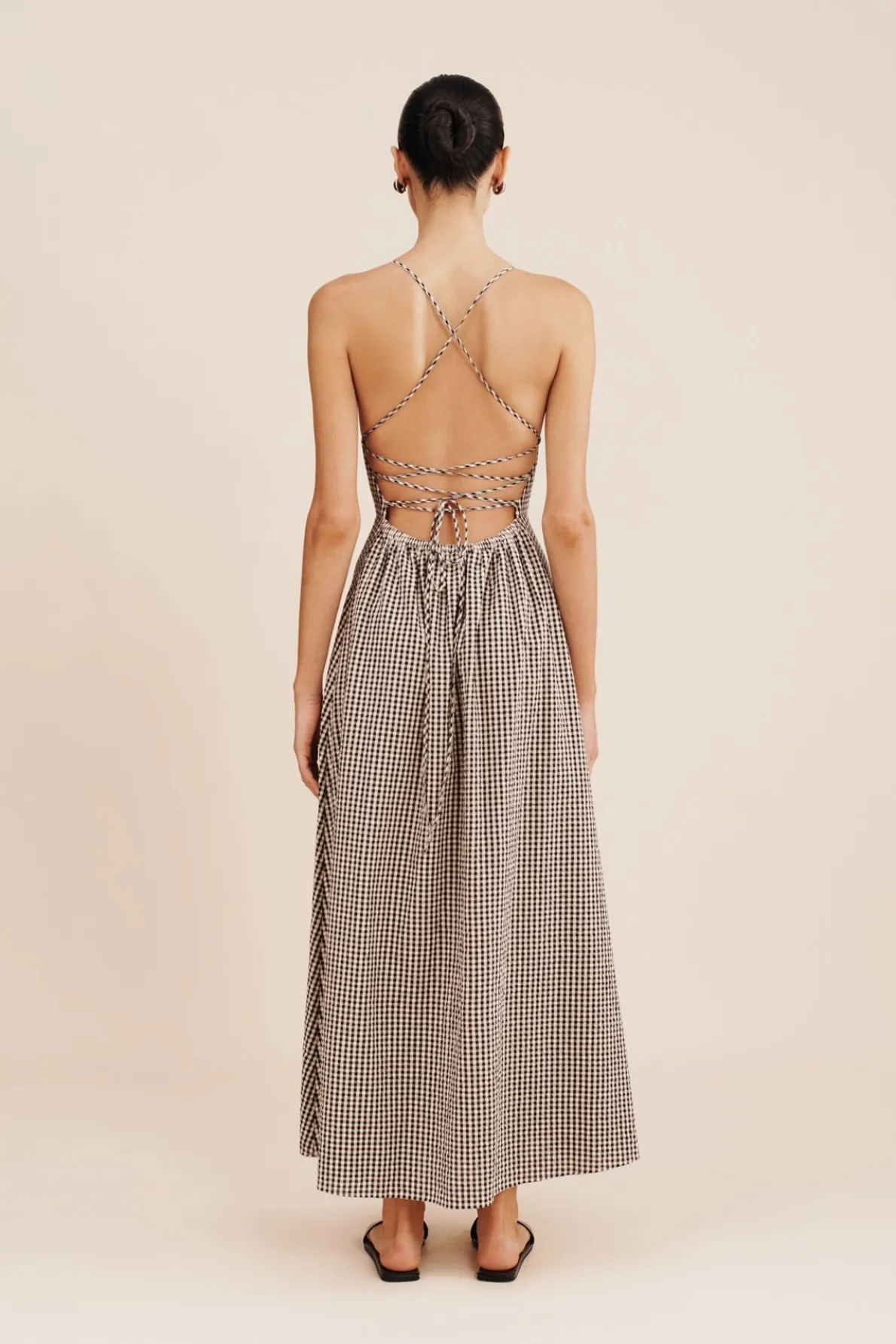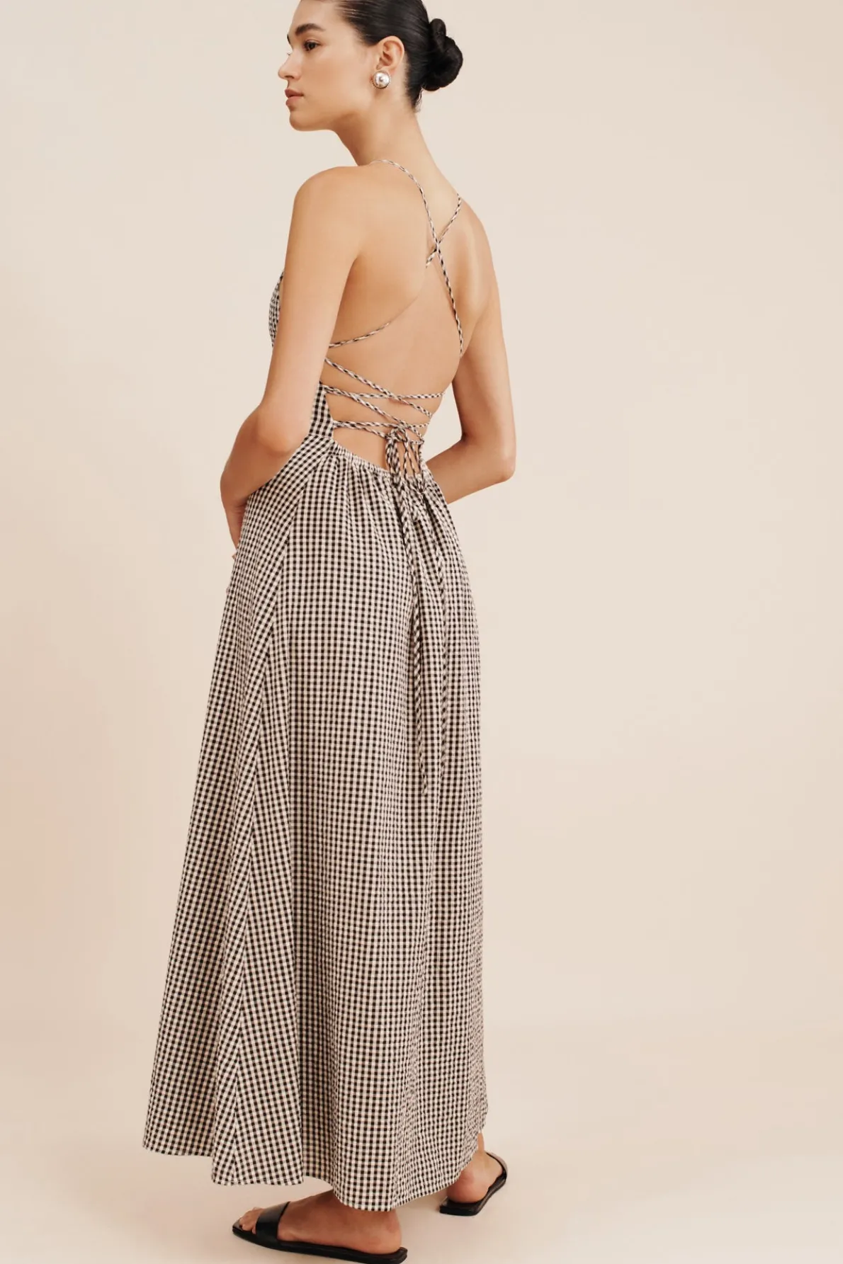 Patterned with nostalgic gingham, The Lori Dress is a statement piece perfect for both day and evening wear. It features a flattering square neckline, elasticated back and free-flowing maxi skirt. It turns to reveal a stunning open back with an adjustable tie feature.
