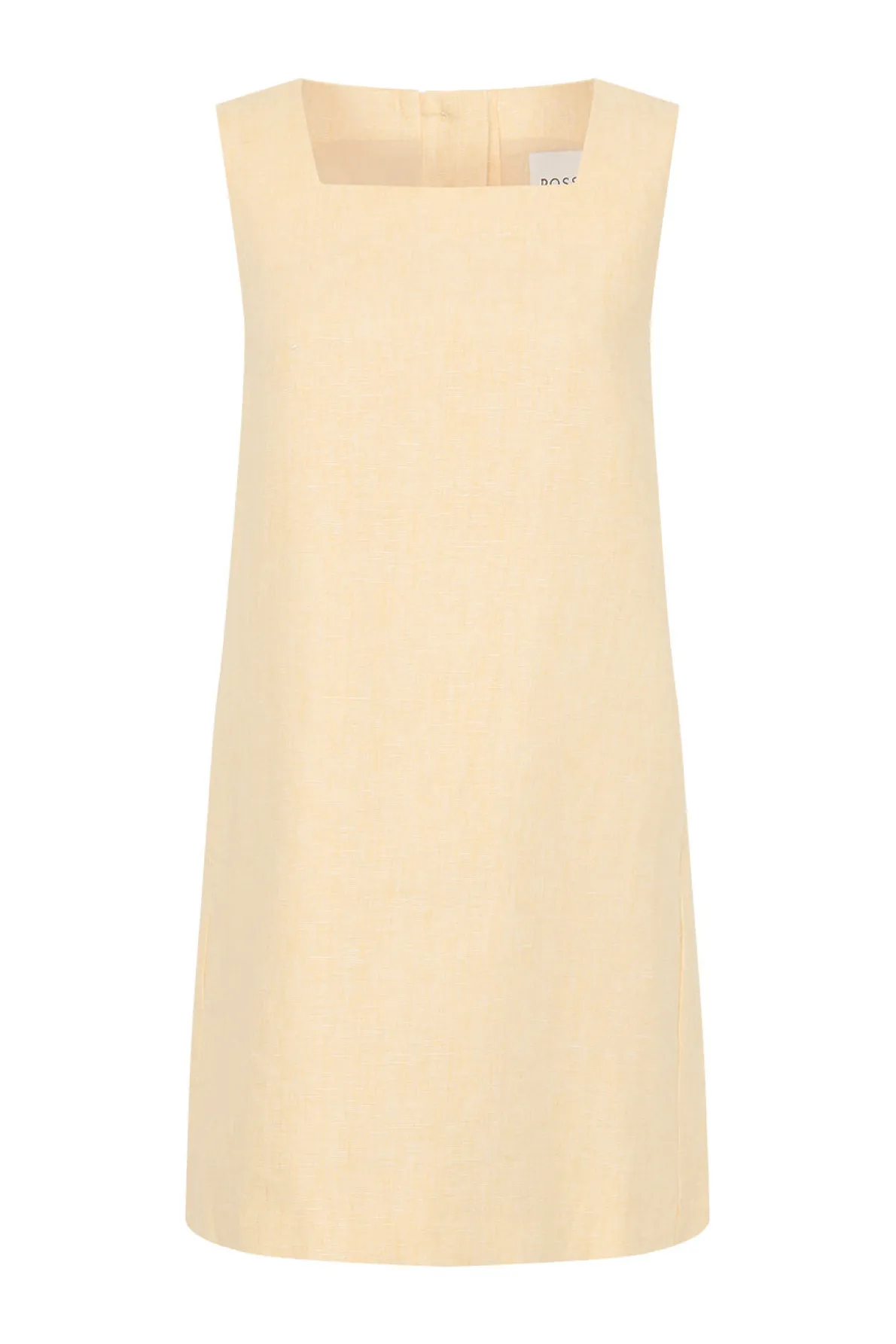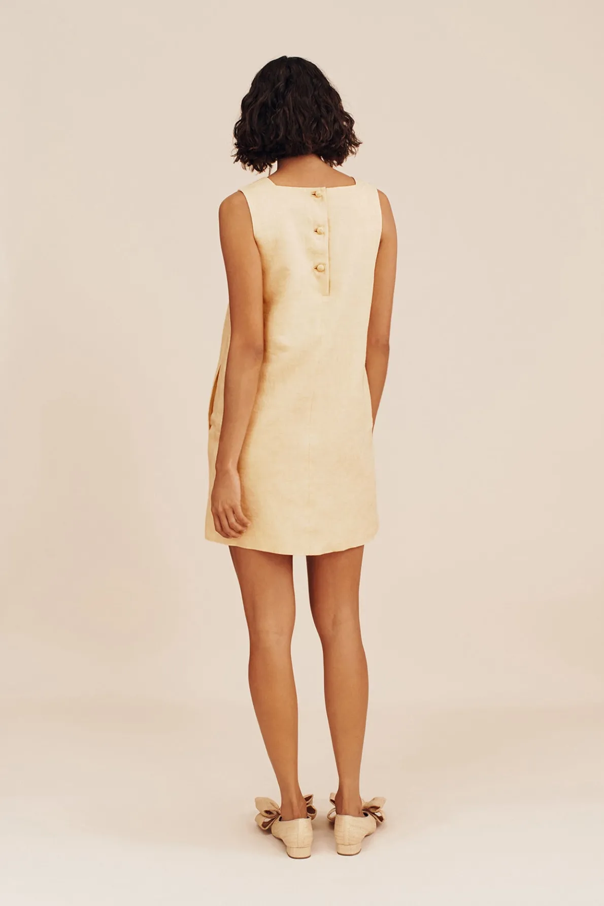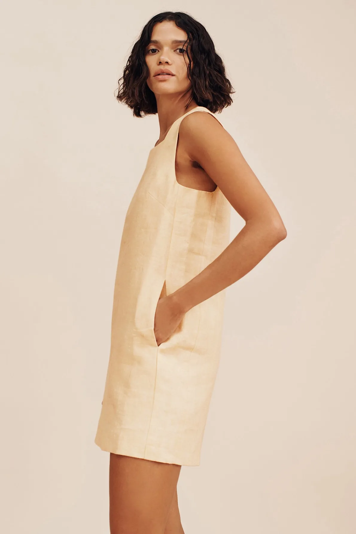 Tailored in mid-weight linen, the Rio Mini Dress features an elegant, high square neckline and fitted silhouette. Self-covered buttons extend down the centre front, while the back turns to reveal a cinch strap to tailor the fit.