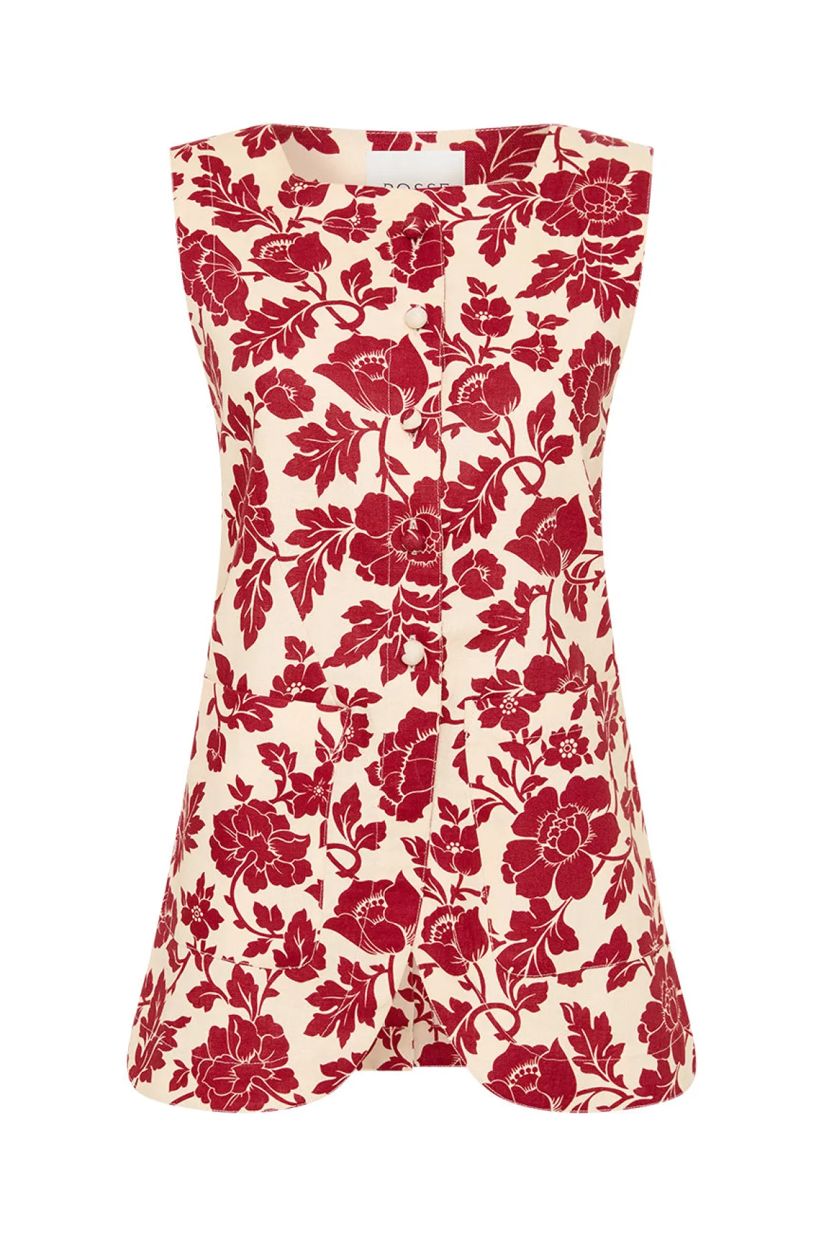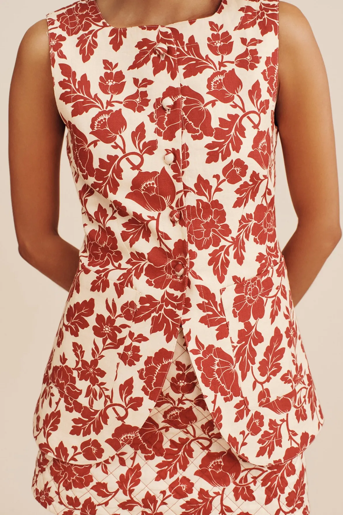 Adorned with vintage-inspired florals, the Romeo Vest is cut from mid-weight linen and is designed for a close fit. It features an elegant high neckline, self-covered centre-front buttons and a peplum hem.