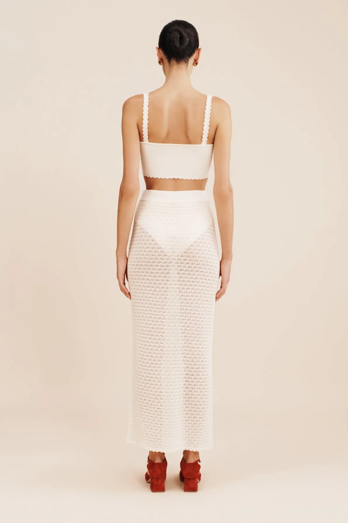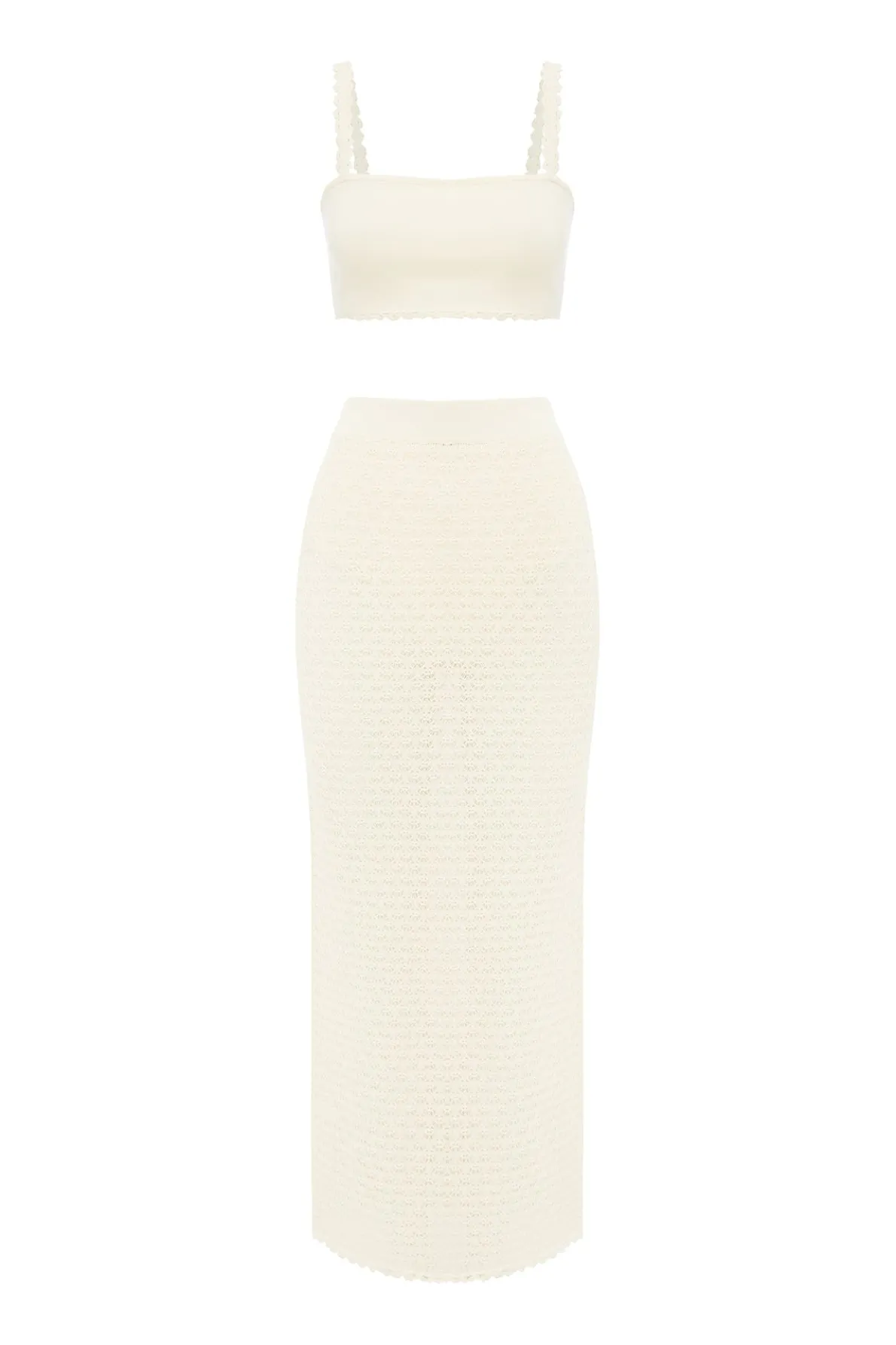 Our antique-inspired three-piece Romy Set is crafted from the softest viscose blend. It features a cropped bralette, high-waisted briefs with moderate coverage and a maxi skirt adorned with crochet knit to layer on top. The subtle cream hue makes it perfect for a memorable bridal moment. It will look just as chic styled on its own as it will with an oversized jacket layered on top.