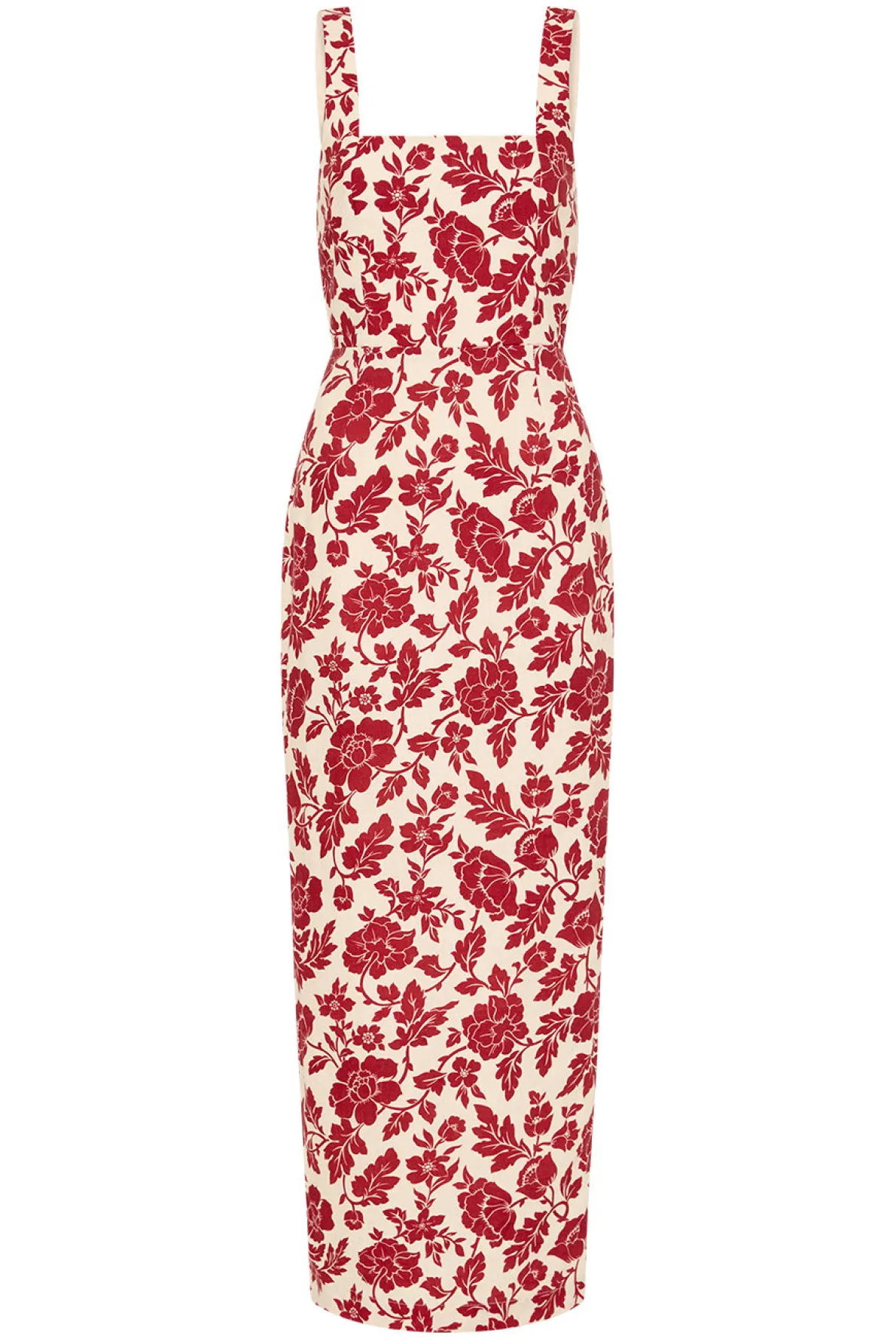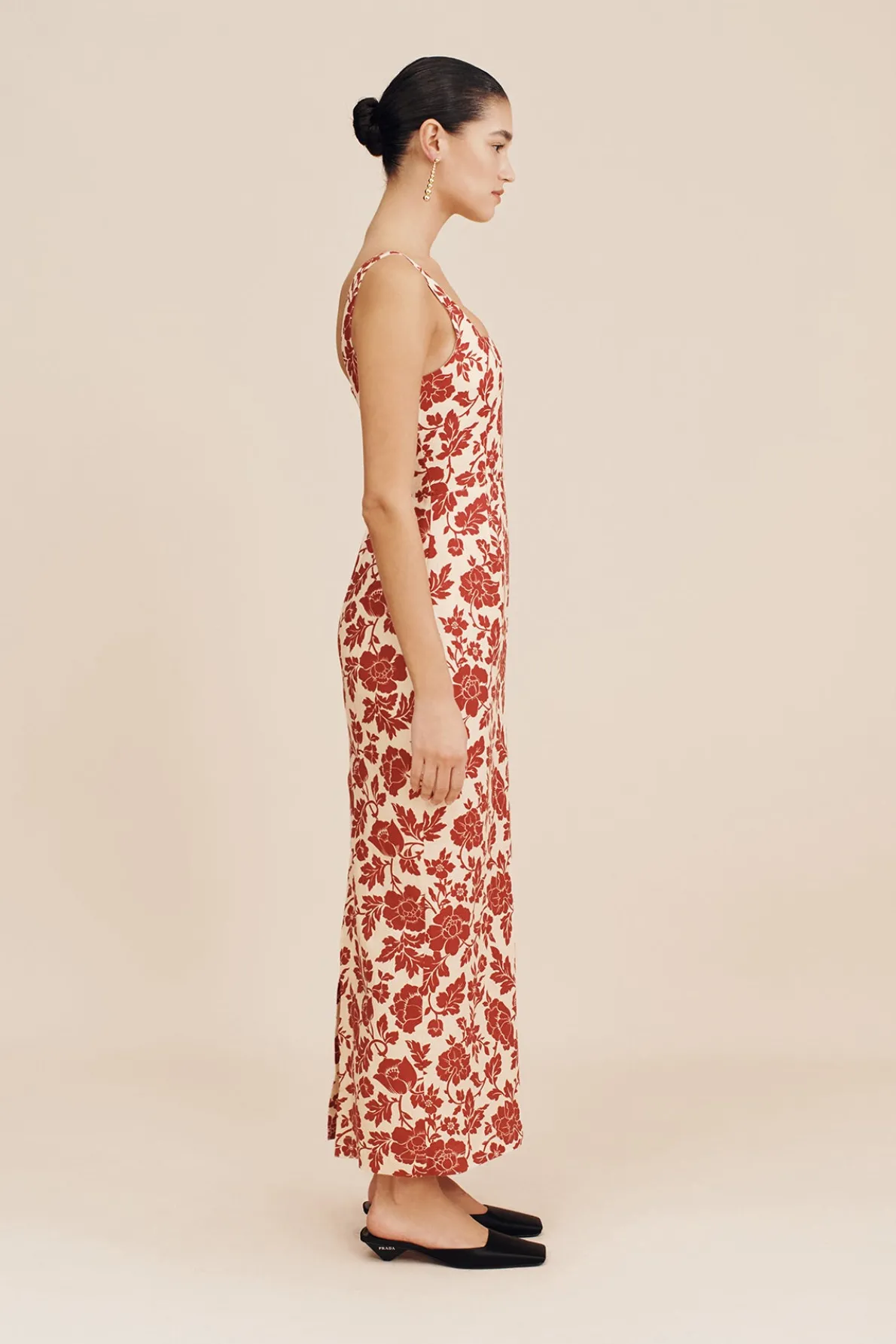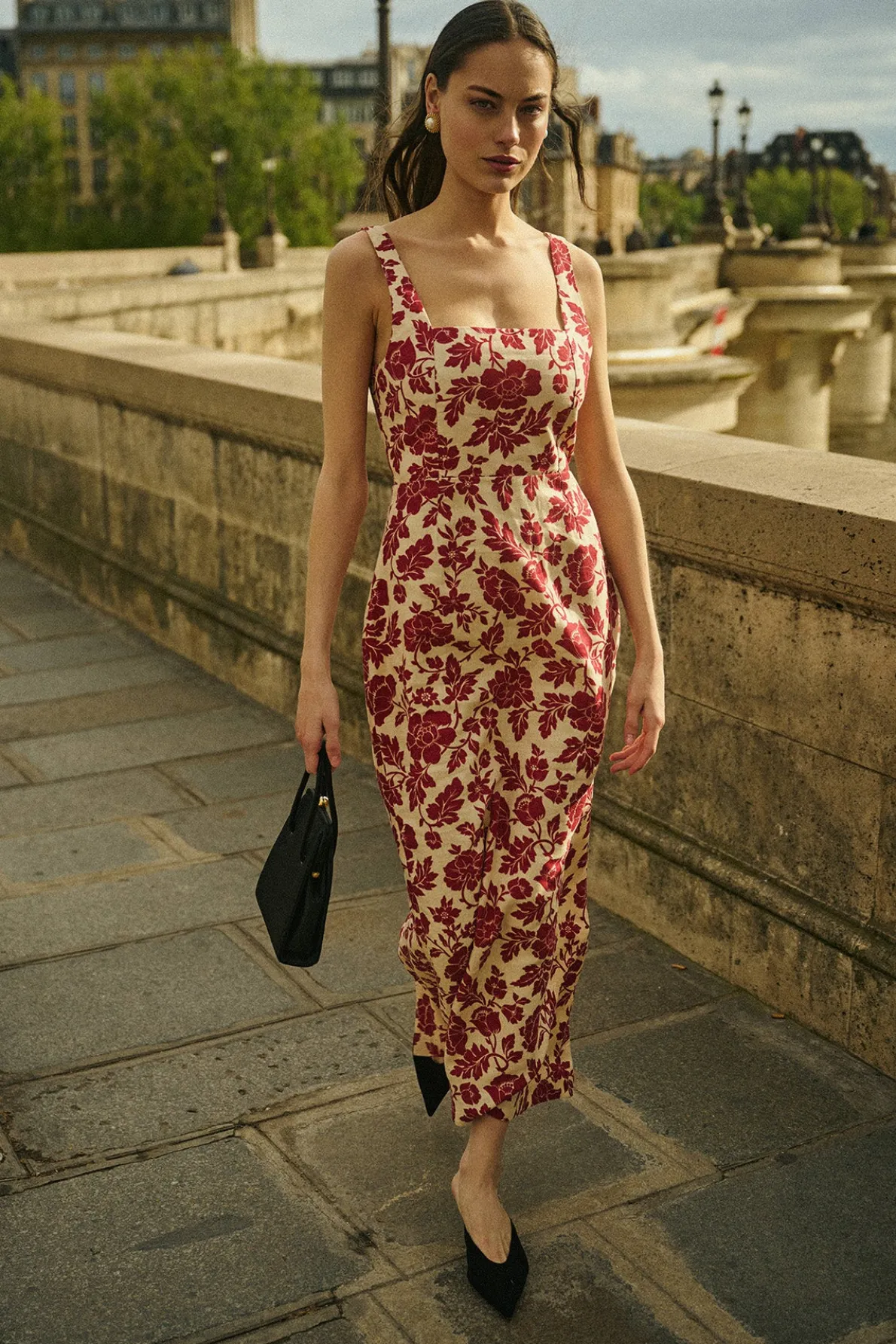 Adorned with vintage-inspired florals, the Skyla Column Dress features an elegant square neckline, wide straps and a statement split at the back to allow for movement. A chic option for both day and evening wear.