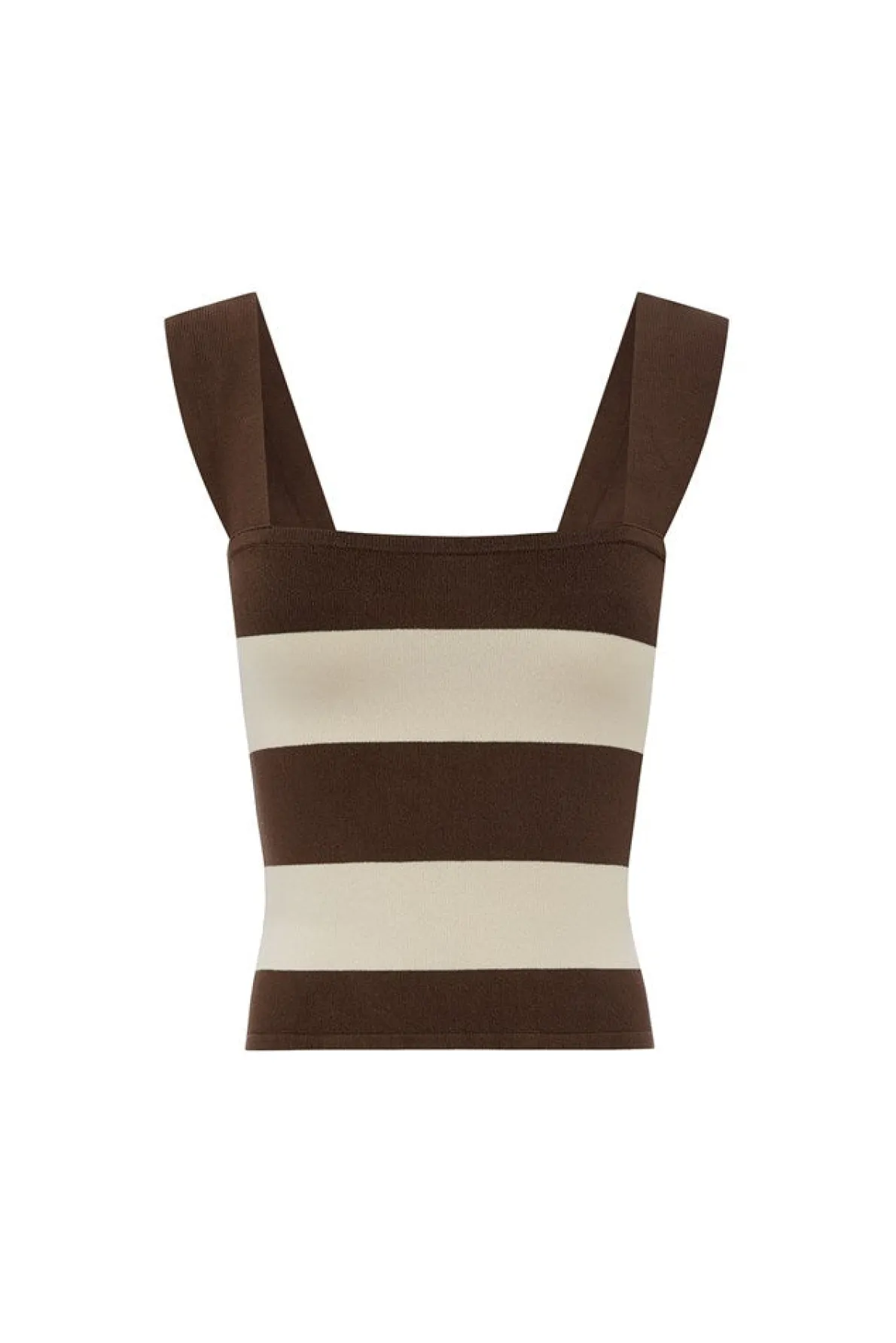 The Theo Cami has an elegant square neckline and is patterned with classic chocolate and cream stripes. It’s cut from stretch-knit and is designed for a close fit. Style yours with high-rise denim.